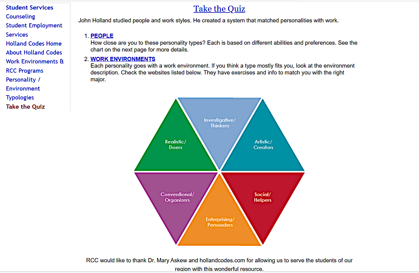 Rogue Community College has a career assessment, RIASEC/Holland Codes descriptions, career information, and training program/ college major lists.